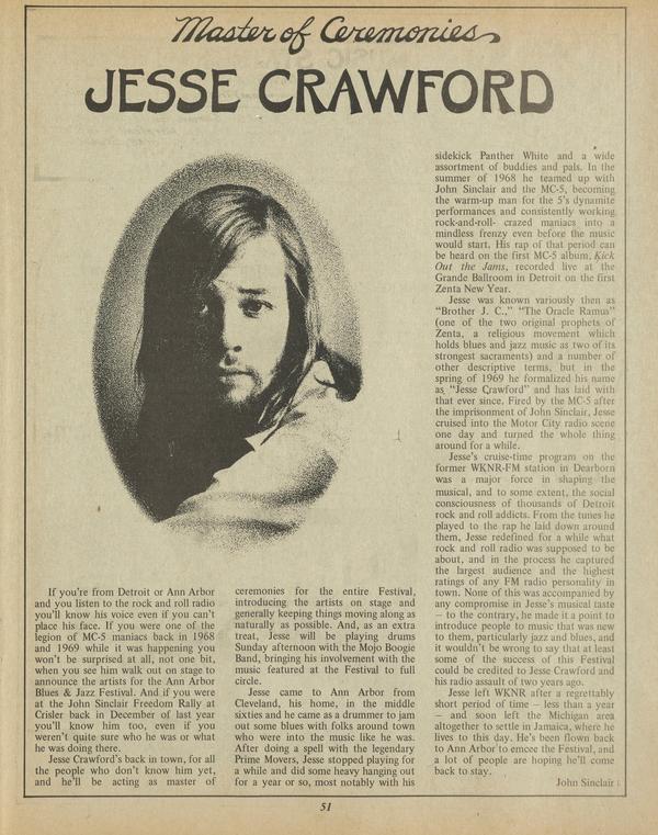 As the producers of the Ann Arbor Blues & Jazz Festival 1972, The Rainbow Multi-Media Corporation is proud to welcome you to Otis Spann Memorial Field, Ann Arbor, and three days of the most exciting blues and jazz music we were able to arrange for this weekend.