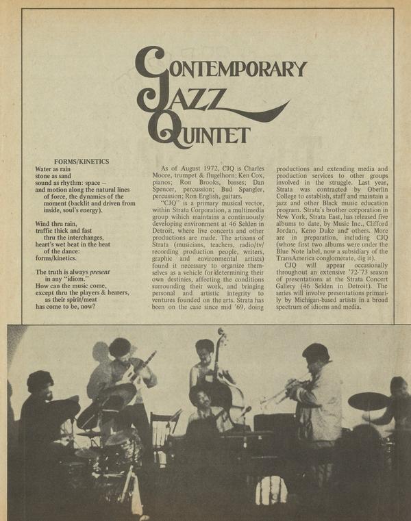 As of August 1972, CJQ is Charles Moore, trumpet & flugelhorn; Ken Cox, pianos; Ron Brooks, basses; Dan Spencer, percussion; Bud Spangler, percussion; Ron English, guitars. “CJQ” is a primary musical vector, within Strata Corporation, a multimedia group wihich maintains a continuously developing environment at 46 Selden in Detroit, where live concerts and other productions are made.