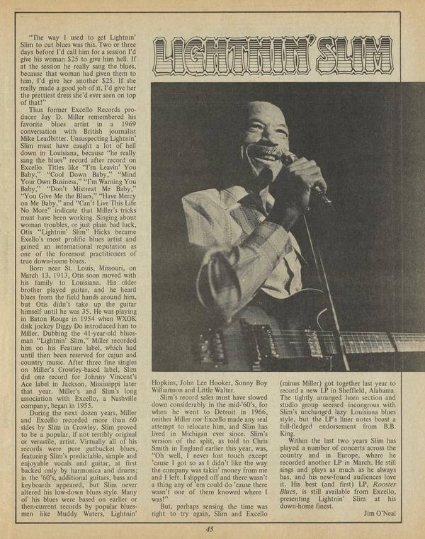“The way I used to get Lightnin’ Slim to cut blues was this. Two or three days before I’d call him for a session I’d give his woman $25 to give him hell.”