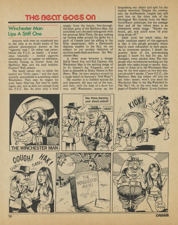 Anyone with even an occasional eye to the tube is no doubt aware of the cultural phenomenon known as the "cigarette man." Or rather was aware, before the F.C.C. so neatly — if somewhat belatedly — invited cigarette advertising not to appear on television, thereby freeing us forever from the Marlboro Man and his soul buddies.