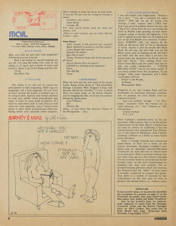 Have you ever sat and read your magazine? It’ll knock you on your ass. Here I am sitting by myself laughing my ass off. I’ve read the entire Feb. issue in one sitting (a 12 pack and a bottle of wine) and loved it. Keep it up Lester Bangs and the rest.