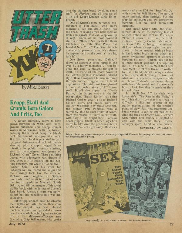 A certain animosity seems to have grown between the West Coast underground publishers and Krupp Comics Works in Milwaukee, with the former accusing the latter of being the (shudder) Charlton of underground comics. But this bad blood is generated in part by great distances and lack of understanding, plus Krupp’s dogged determination to publish certain stinkers, such as the adolescent wet-dreams of Richard “Grass” Green.