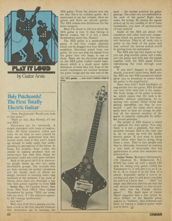 “Holy Patchchords! Would you look at that guitar!” “Have no fear, Boy Howdy, it’s the new XES.” Electronics are for everybody. A simple statement with loads of implications. All those transistor radios and color tvs we feed on were created by little men who understand how electronics work, even if they aren’t doped up enough to really apply that understanding to perceptions of the future.