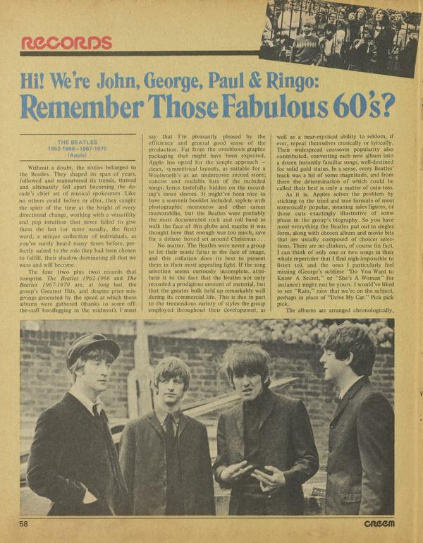 THE BEATLES — 1962-1966, 1966-1971 (Apple):: Great group w/hit potential galore. Quartet clefs own material exclusively, performs in variety of styles ranging from hard rock loaded w/teen appeal to quiet ballads ("Yesterday"). Hot chart possibilities — watch closely, Mr. Retailer!