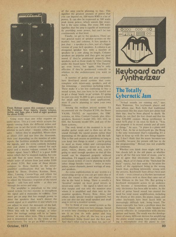 "Actual sounds are running out," says, Rick Wakeman, Yes keyboards player and solo album star. Rick feels that traditional instruments like the piano have just about had their day; they've been played to death. He thinks he can find the lost chord and that his new $20,000 custom Moog synthesizer is what he'll play it on once he finds it.