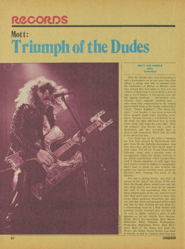 MOTT THE HOOPLE Mott (Columbia) Mott the Hoople have been threatening to pull a masterpiece on us ever since their first album, a strong slow tide of outtakes from the headwaters of Blonde on Blonde. Later they proved they had mania to burn too; the wildest of Brain Capers was as fettle a spew of rage as we've known.