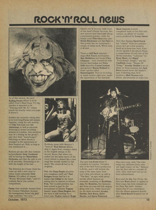 As of this minute, the next Rolling Stones album is to be called Goat's Head Soup. It's big number is reported to be “Dancing with Mr. D,” which stands for exactly what you hope it doesn’t. Insiders are currently taking bets as to how long Focus will remain together, citing the solo activity of Thijs Van Leer and Jan Akkerman, as well as reported dickering at recent recording sessions in London.