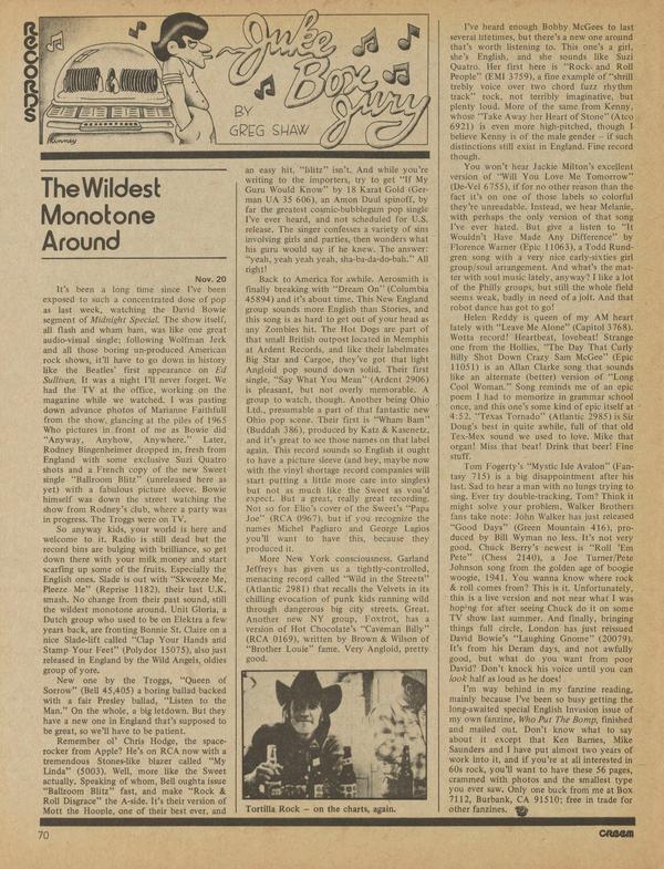 Having discovered, much to our embarrassment, that the Sylvia Topp involved in the production! of As They Were is none other than Tuli Kupferberg's wife, we were not at all surprised to find in our mail one morning a copy of Tuli's latest tome, Listen to the Mockingbird and the skeleton key to the latest CREEM contest, or quiz, or whatever it is. No prizes this time, friends.