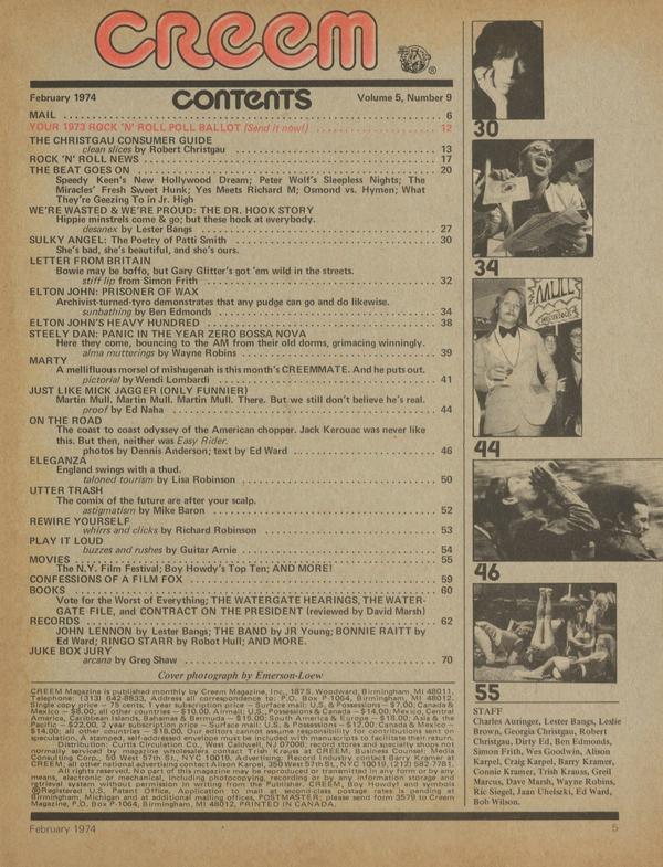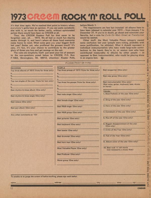 It's that time again. We've reached that point in history where everybody's gotta have an opinion. If you can paste somebody else with it, so much the better; verily, without opinionated putzes there would have been no CREEM at all. Thus, the CREEM Readers Poll for that never to be forgotten year, uh... 1973.