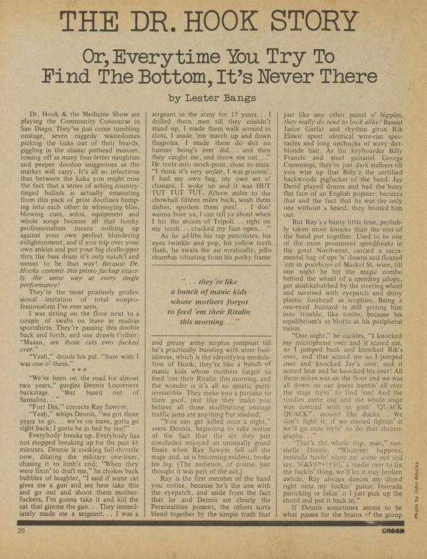 Dr. Hook & the Medicine Show are playing the Community Concourse in San Diego. They've just come tumbling onstage, seven raggedy wastedorties picking the ticks out Of their beards, giggling in the classic pothead manner, tossing off as many four-letter naughties and peepee doodoo sniggerines as the market will carry.