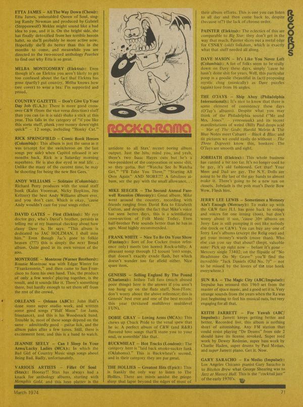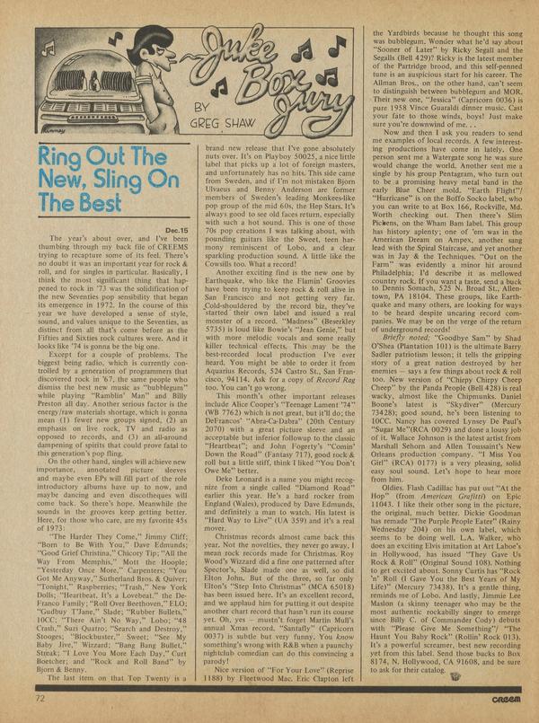 The year's about over, and I've been thumbing through my back file of CREEMS trying to recapture some of its feel. There's no doubt it was an important year for rock & roll, and for singles in particular. Basically, I think the most significant thing that happened to rock in "73 was the solidification of the new Seventies pop sensibility that began its emergence in 1972.