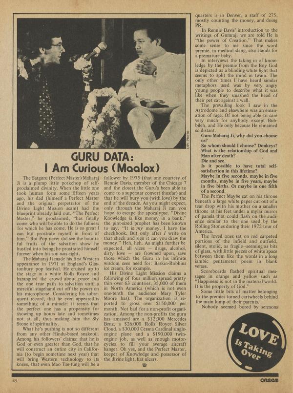 "Blissed out." In the corners of the eyes a squinch. The placid glossy smiling faces I saw at the Astrodome in Houston for Millenium 73 were the lovers of God, or premies of the soi disant 15 year old Perfect Master, Guru Maharaj Ji. "A thousand years of peace for people who want peace."