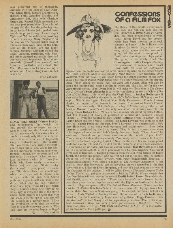 The theme of this month is Hollywood goes rock and roll, and rock and roll goes Hollywood. David Kung Fu Carradine has been moonlighting between takes. Seems David and his brother Kevin have been showing up at rock concerts and small clubs in Hawaii and Southern California.