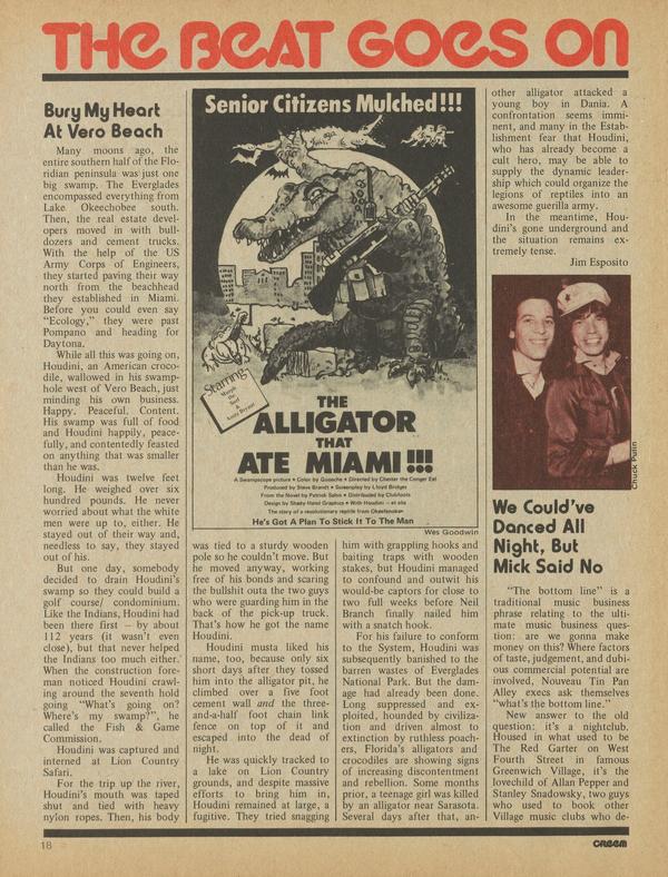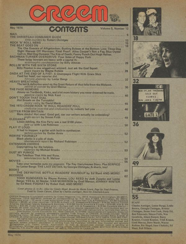 I’ve just been filling in the 1973 Creem Rock V Roll Poll, which is at least more entertaining than the ones NME and MM serve up. Most pathetic of the year? David Bedford’ in the Commonwealth Games 10,000 metres. Comeback of the year? Alvin Stardust (alias Shane Fenton, minor star of the 60s British bandwagon) — three months in the hit parade with “My Coo-Ca-Choo.”