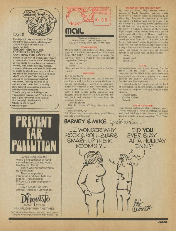 Please.send letters to: MAIL Dept., CREEM Magazine P.O. Box P-1064, Birmingham, Ml 48012 DEAR CREEM Do you realize that picture of Elton John on page 35 of the Feb. issue looks just like Radar from M.A.S.H.? If he wasn’t wearing the superstar duds, I’d swear he was our favorite corporal on furlough. Frank Burns Korea (That was no Elton, that was Gordon Sinclair. -Ed.)
