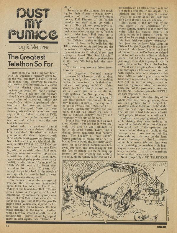 They should’ve had a big tote board with the weekend’s highway death toll on the wall but they did not. Just the big money tote, signifying to exactly what extent the Memorial Day T-Viewers felt like digging down into their pockets on behalf of wha-? Highway safety? Yes, a telethon for highway safety! Y’see highway non-safety’s the one realm of corporeal misfortune everybody’s either experienced fir hand or at least seen and gawked at sure ain’t like cystic fibrosis or myasthenia gravis (after all, who’s ever seen any victims of them except of TV?).