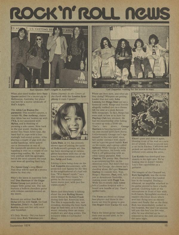 When pint-sized leather siren Suzy Quatro "arrived for a recent gig in Melbourne, Australia, her plane was met by a motor cavalcade of Hell’s Angels. The Alvin Lee Rumor Department: This month’s source, a certain Mr, Dee Anthony, claims that Alvin has not broken up with TYA, is associated with My Ion, and is thinking of pursuing a solo career.