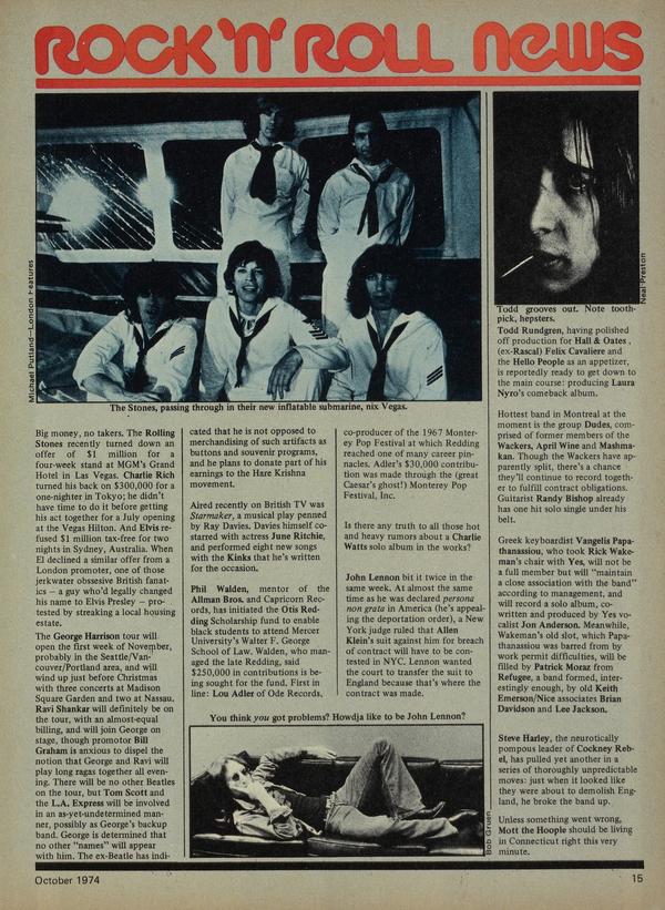 Big money, no takers. The Rolling Stones recently turned down an offer of $1 million for a four-week stand at MGM’s Grand Hotel in Las Vegas. Charlie Rich turned his back on $300,000 for a one-nighter in Tokyo; he didn’t have time to do it before getting his act together for a July opening at the Vegas Hilton.