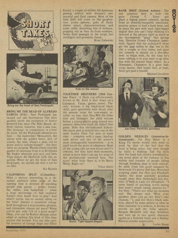 BRING ME THE HEAD OF ALFREDO GARCIA (UA):: Sam Peckinpah has turned out one horrendous film after another (with the exception of Junior Bonner) ever since The Wild Bunch. Alfredd Garcia, however, hits a new low. The Getaway, in comparison, is a tour de force.