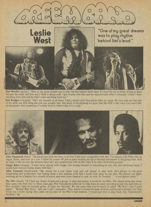 Jimi Hendrix (guitar): “One of my great dreams was to play rhythm behind Jimi’s lead. It’s hard for me to think of him as dead because his music still lives and I think it always will. I got to play with him and we enjoyed each other’s company. I didn’t want anything from him and he didn’t want anything from me.”