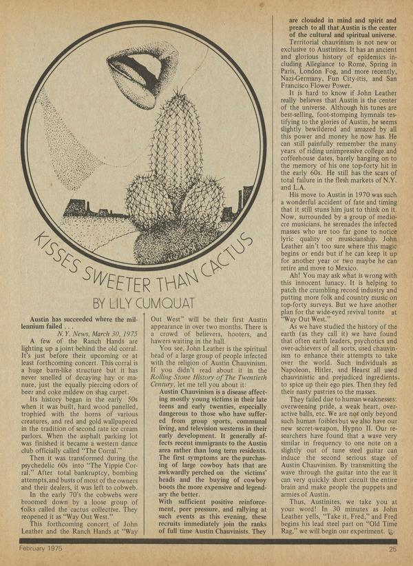 Austin has succeeded where the millennium failed ... N.Y. News, March 30, 1975 A few of the Ranch Hands are lighting up a joint behind the old corral. It’s just before their upcoming or at least forthcoming concert. This corral is a huge barn-like structure but it has never smelled of decaying hay or manure, just the equally piercing odors of beer and coke mildew on shag carpet.
