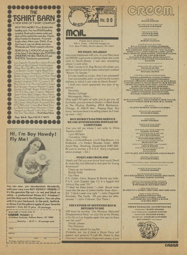 NO ZIGGY, NO JIGGY I am quite displeased with you. In your May issue of CREEM, a girl wrote in asking where she could write to David Bowie. I was also wondering where I could write. Well. I wrote to H. Rap Brown (it's where you said to write to) arid the letter came back marked "Return To Sender."