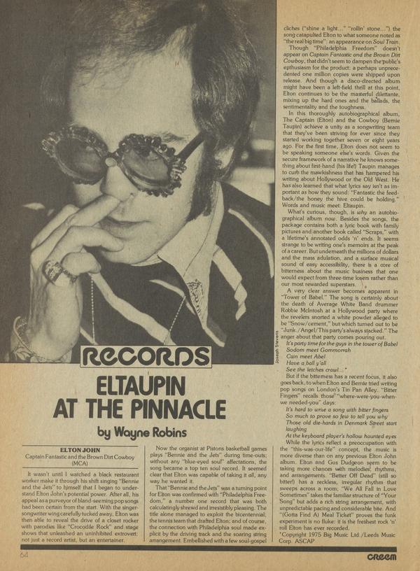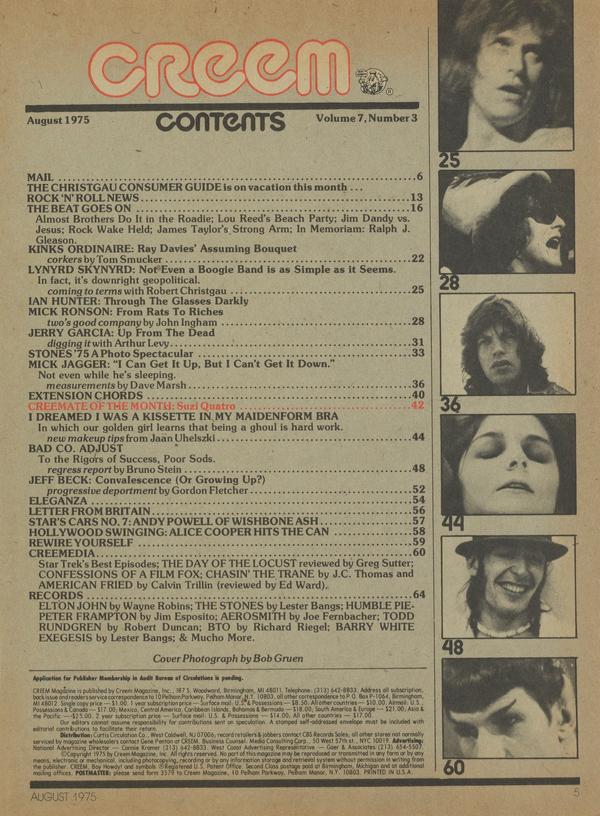 July Alice On (Bangs); Grand Funk (Uhelszki); Nilsson with Beatles & Dylan; Sparks; Wakeman; Queen; Phony Record Labels; Bette Midler; Jungle Music; Eno. Reviewed: Bad Co., Steely Dan, Kiss, more.