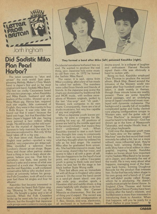 The latest sensation to "stun and amaze" the rock world (just paraphrasing Melody Maker's Chris Welch here) is Japan's first and so far most original rock band, Sadistic Mika Band. The first we cocky Caucasians heard of it was two years ago, when Kazuhiko and Mika Katoh, husband and wife leaders of the combo, showed up at a Roxy Music gig.