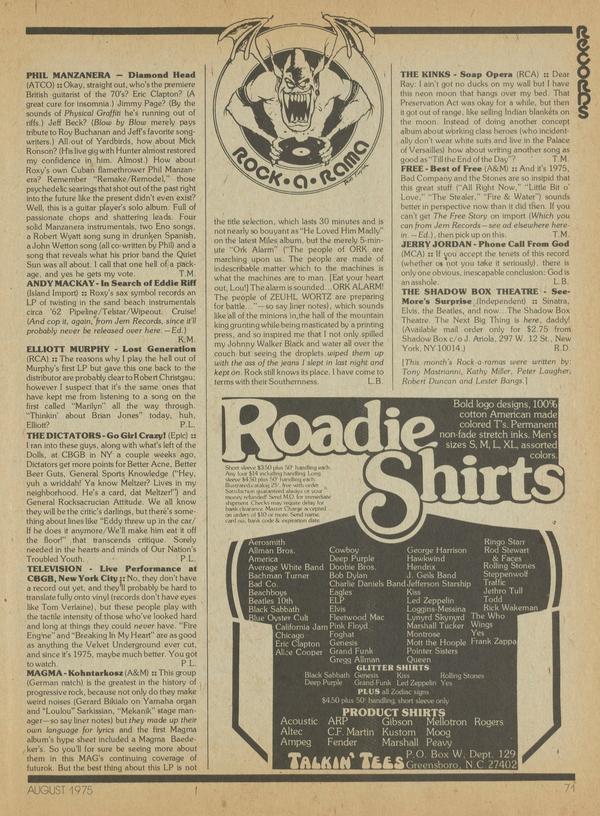PHIL MANZANERA - Diamond Head (ATCO) ::Okay, straight out, who's the premiere British guitarist of the 70's? Eric Clapton? (A great cure for insomnia.) Jimmy Page? (By the sounds of Physical Graffiti he's running out of riffs.) Jeff Beck? (Blow by Blow merely pays tribute to Roy Buchanan and Jeff s favorite songwriters.)
