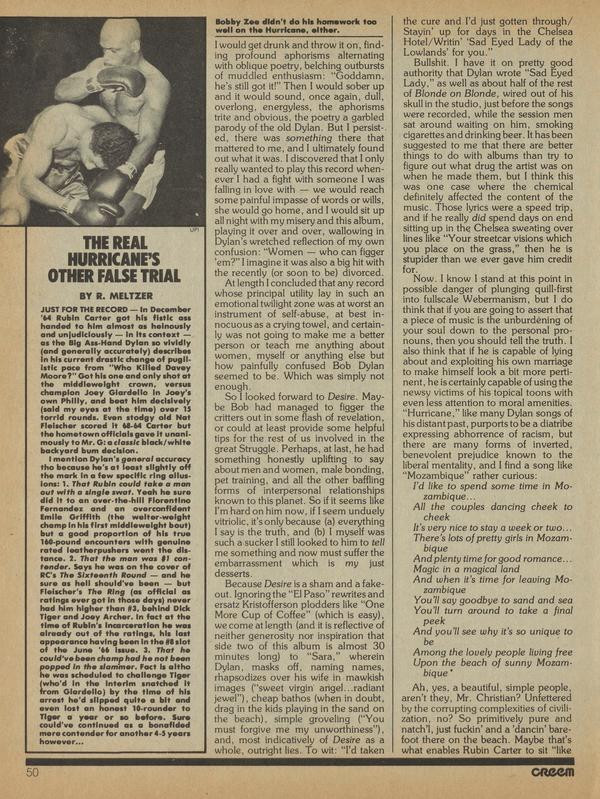 In December '64 Rubin Carter got his fistic ass handed to him almost as heinously and unjudiciously — in its context — as the Big Ass-Hand Dylan so vividly (and generally accurately) describes in his current drastic change of pugilistic pace from "Who Killed Davey Moore?"