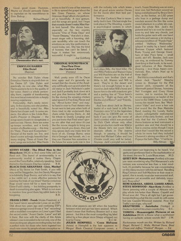 KENNY STARR - The Blind Man in the Bleachers (MCA) :: And some folks call Lou Reed sick. This brand of sentimentality is so putrescently morbid it makes Harry Chapin sound like Franz Kafka, relatively speaking. Send this kid to the showers (Dachau variety). R. R. BLACK OAK ARKANSAS - Live, Mutha!