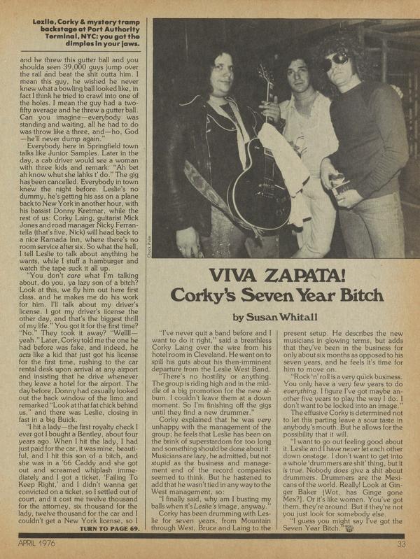 "I've never quit a band before and I want to do it right," said a breathless Corky Laing over the wire from his hotel room in Cleveland. He went on to spill his guts about his then-imminent departure from the Leslie West Band. "There's no hostility or anything.