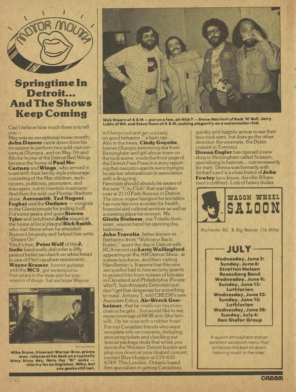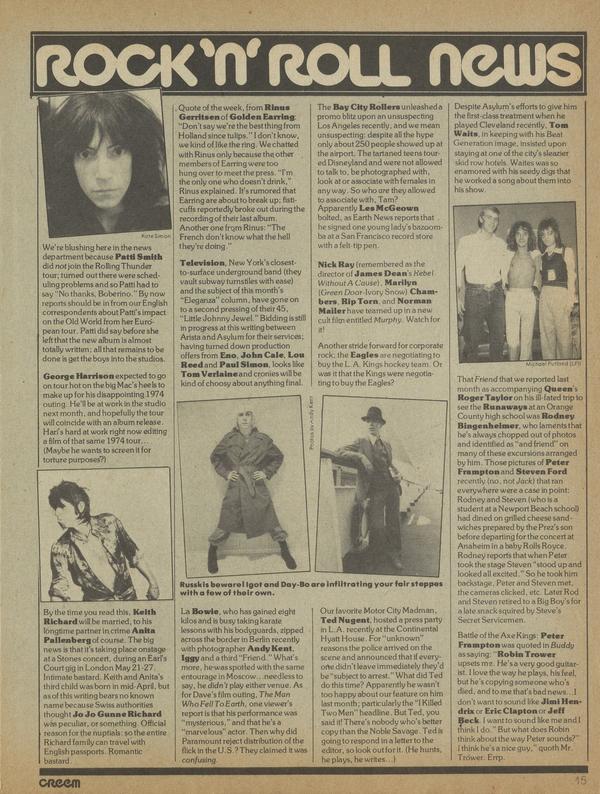 We're blushing here in the news department because Patti Smith did not join the Rolling Thunder tour; turned out there were scheduling problems and so Patti had to say "No thanks, Boberino." By now reports should be in from our English correspondents about Patti's impact on the Old World from her European tour.