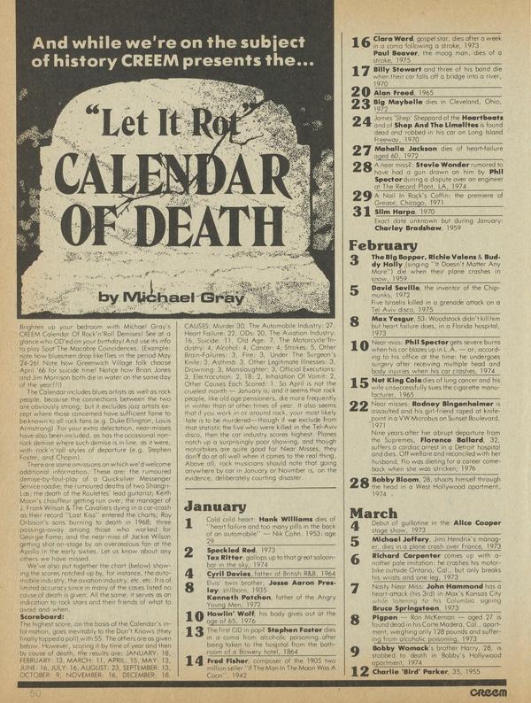 Brighten up your bedroom with Michael Gray's CREEM Calendar Of Rock'n'Roll Demises! See at a glance who OD'ed on your birthday! And use its info to play Spot The Macabre Coincidences. (Example: note how bluesmen drop like flies in the period May 24-26! Note how Greenwich Village folk choose April '66 for suicide time! Notice how Brian Jones and Jim Morrison both die in water on the some day of the year!!!)