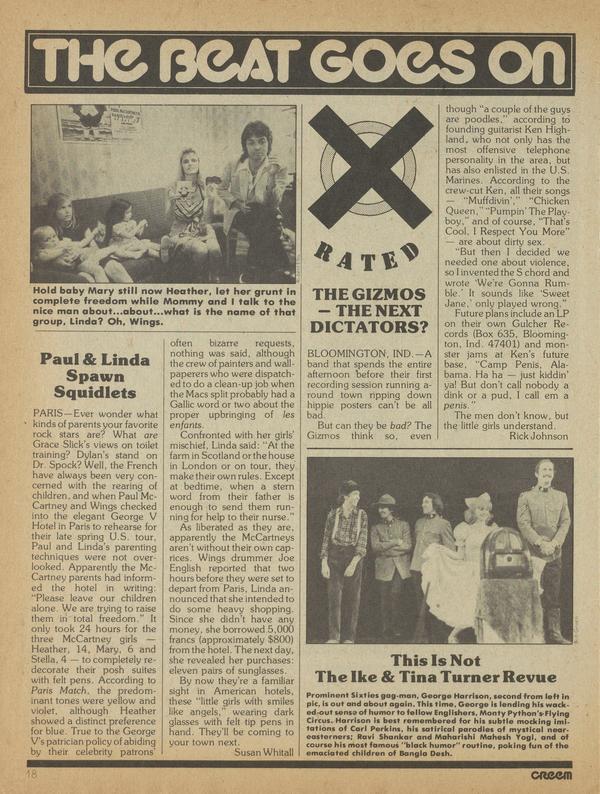 Paul & Linda Spawn Squidlets PARIS—Ever wonder what kinds of parents your favorite rock stars are? What are Grace Slick's views on toilet training? Dylan's stand on Dr. Spock? Well, the French have always been very concerned with the rearing of children, and when Paul McCartney and Wings checked into the elegant George V Hotel in Paris to rehearse for their late spring U.S. tour, Paul and Linda's parenting techniques were not overlooked.
