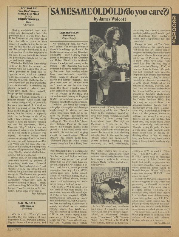 No "Black Dog" here, no "Kashmir" either. Yet though Presence doesn't bombingly pockmark the landscape or scale snowy Himalayan heights even if Jimmy Page's guitar is becoming a riff Osterizer and Robert Plant's voice is shredding at the edges and tearing in the middle — still, Zeppelin has such command of heavy-metal weaponry that even their modest efforts have scorched-earth capability.