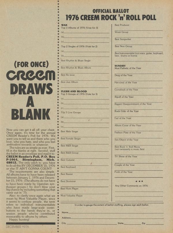 Now you can get it all off your chest. Once again, it's time for the annual CREEM Reader's Poll for 1976. We want you to tell us and them who you love, who you hate, and who you feel ambivalent towards or whatever. The rules are as simple as ever. First, fill in the blanks at right. Second, stuff the ballot in an envelope and mail it to: CREEM Reader's Poll, P.O. Box P-1064, Birmingham, Mich.