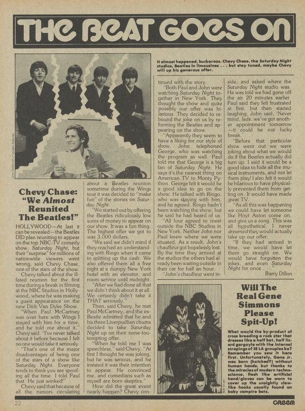 HOLLYWOOD—At last it can be revealed—the Beatles DID plan reuniting to appear on the top NBC-TV comedy show, Saturday Night, but their "surprise" for millions of nationwide viewers went wrong, said Chevy Chase, one of the stars of the show.
