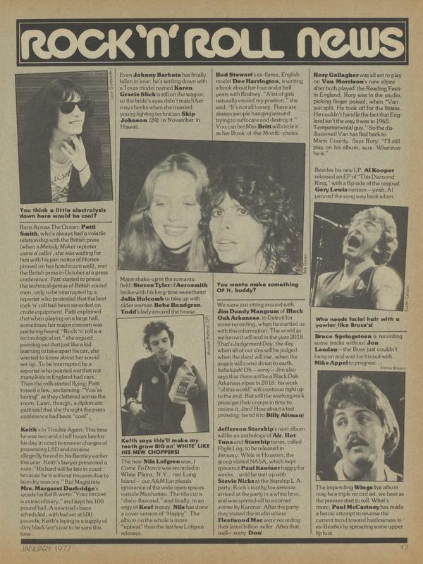 Buns Across The Ocean: Patti Smith, who’s always had a volatile relationship with the British press (when a Melody Maker reporter came a’callin’, she was waiting for him with his pan notice of Horses pinned on her hotel room wall), met the British press in October at a press conference.