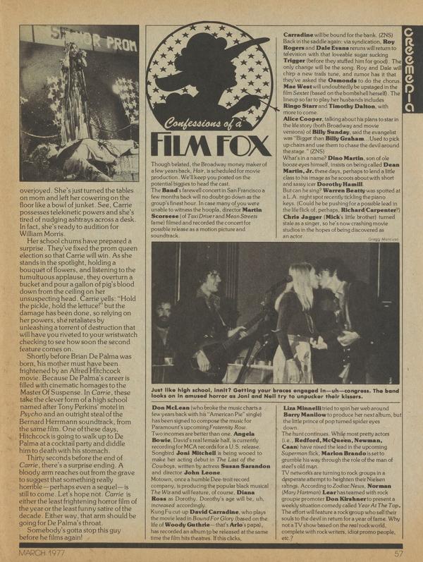Though belated, the Broadway money maker of a few years back, Hair, is scheduled for movie production. We'll keep you posted on the potential biggies to head the cast. The Band's farewell concert in San Francisco a few months back will no doubt go down as the group's finest hour. In case many of you were unable to witness the hoopla, director Martin Scorsese (of Taxi Drive r and Mean Streets fame) filmed and recorded the concert for possible release as a motion picture and soundtrack.