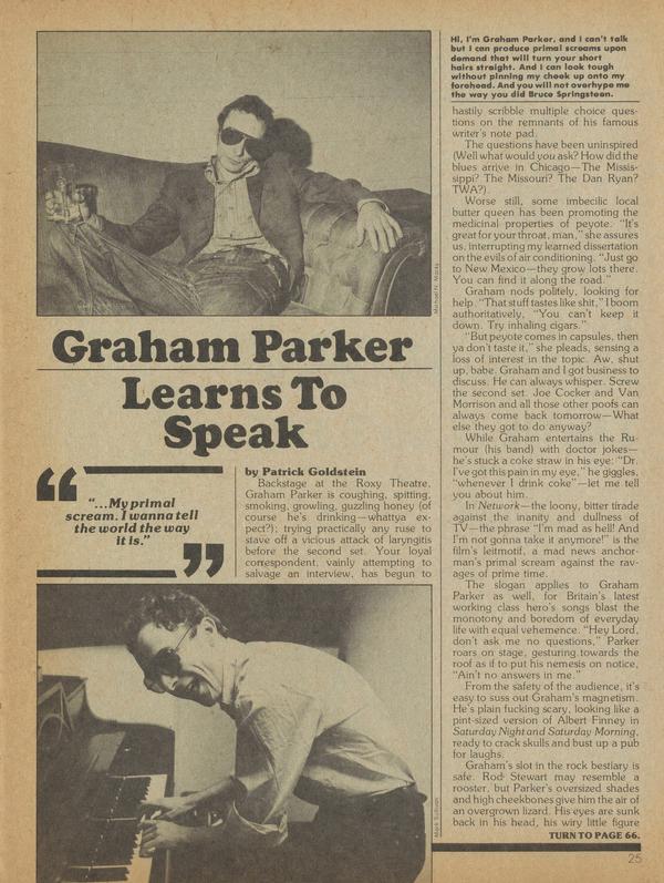 Backstage at the Roxy Theatre, Graham Parker is coughing, spitting, smoking, growling, guzzling honey (of course he’s drinking—whattya expect?).
