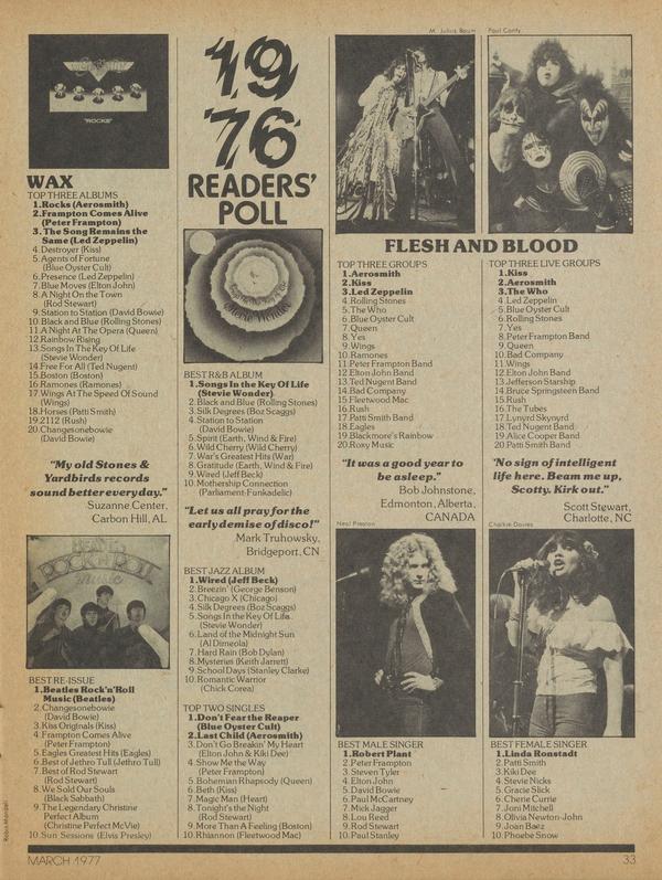 TOP THREE ALBUMS 1 .Rocks (Aerosmith) 2.Frampton Comes Alive (Peter Frampton) 3. The Song Remains tfie Same (Led Zeppelin) 4. Destroyer (Kiss) 5. Agents of Fortune (Blue Oyster Cult) 6.Presence (Led Zeppelin) 7.Blue Moves (Elton John) 8. A Night On the T own (Rod Stewart)