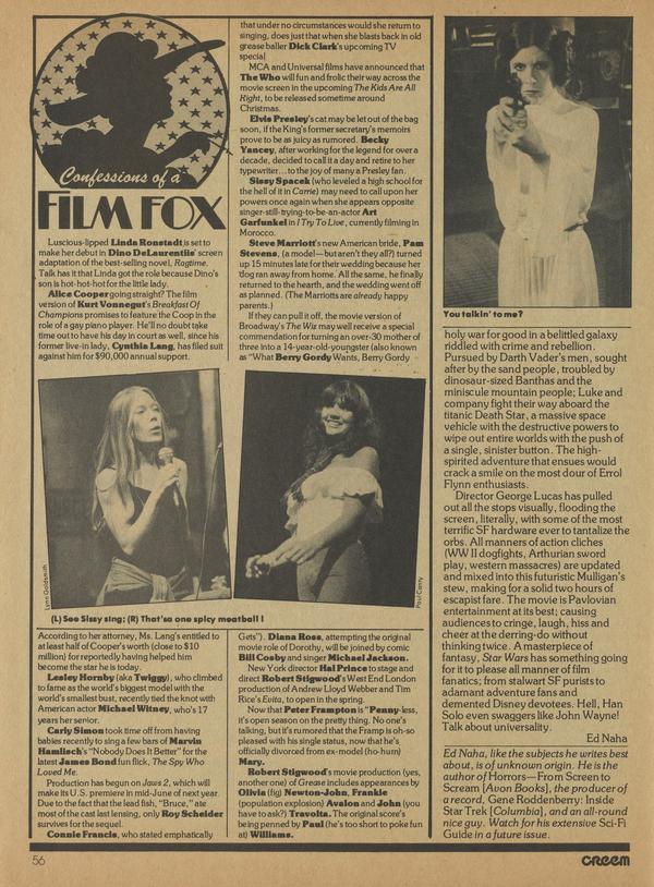 Luscious-lipped Linda Ronstadt is set to make her debut in Dino DeLaurentiis’ screen adaptation of the best-selling novel, Ragtime. Talk has it that Linda got the role because Dino’s son is hot-hot-hot for the little lady. Alice Cooper going straight? The film version of Kart Vonnegat’s Breakfast Of Champions promises to feature the Coop in the role of a gay piano player.