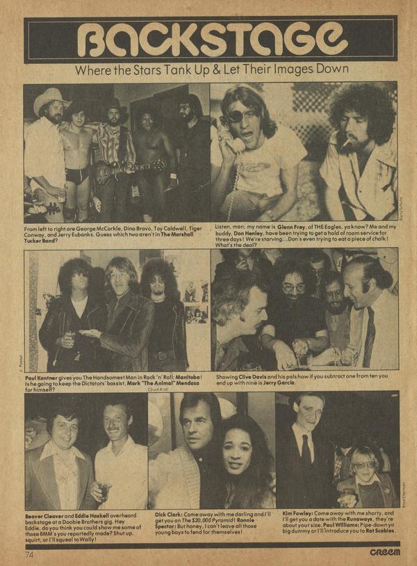 Vivacious thrush Stevie Niche is currently nested in a house in L.A. that used to belong to silent screen star Vilma Hanky, a foreign beauty who was married to another early idol, Rod LaRoque. Said Stevie: “You can tell the house once belonged to someone glamorous. It has a real presence about it." It might have looked like the Damned's REat Scabies and Runaway Joan Jett were about to get cozy in last month’s Backstage photo, but actually they came to blows minutes after our photographer took the picture.