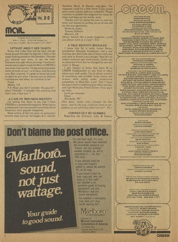 UPTIGHT ABOUT HER TIGHTS Every time I play Kiss and lay back and get those sounds through the phones, I think of the super-looking woman in the Danskins. I thought you showed star form, to say the least. Simmons was right about your legs. I loved your article and am glad it made the Best of CREEM, it was more than worthy.