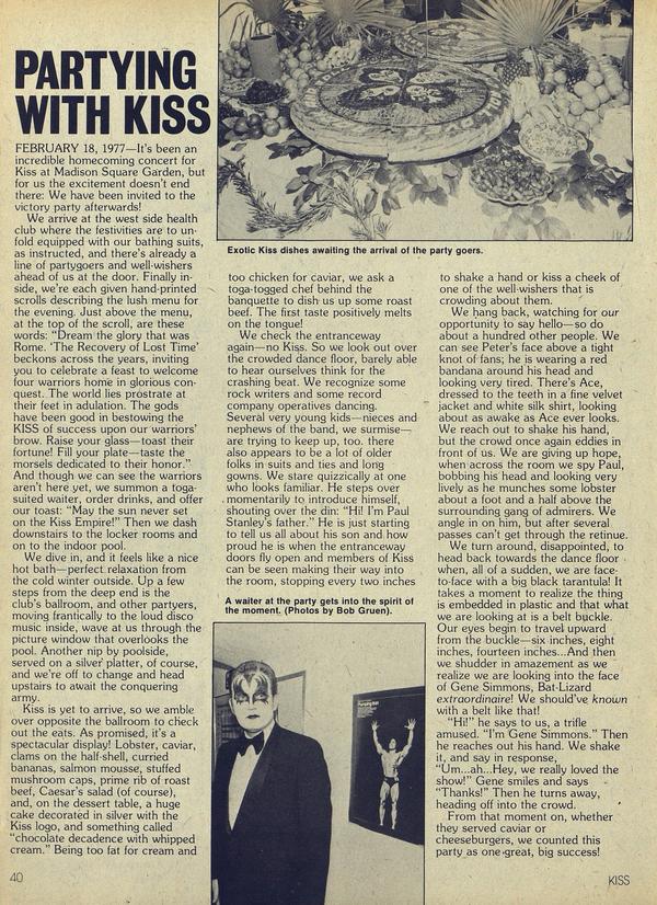 FEBRUARY 18, 1977—It’s been an incredible homecoming concert for Kiss at Madison Square Garden, but for us the excitement doesn’t end there: We have been invited to the victory party afterwards! We arrive at the west side health club where the festivities are to unfold equipped with our bathing suits, as instructed, and there’s already a line of partygoers and well-wishers ahead of us at the door.