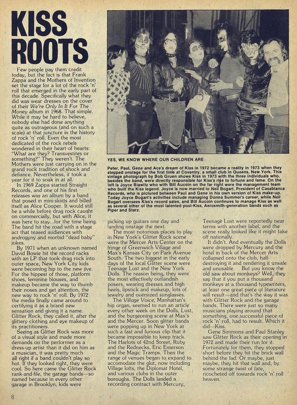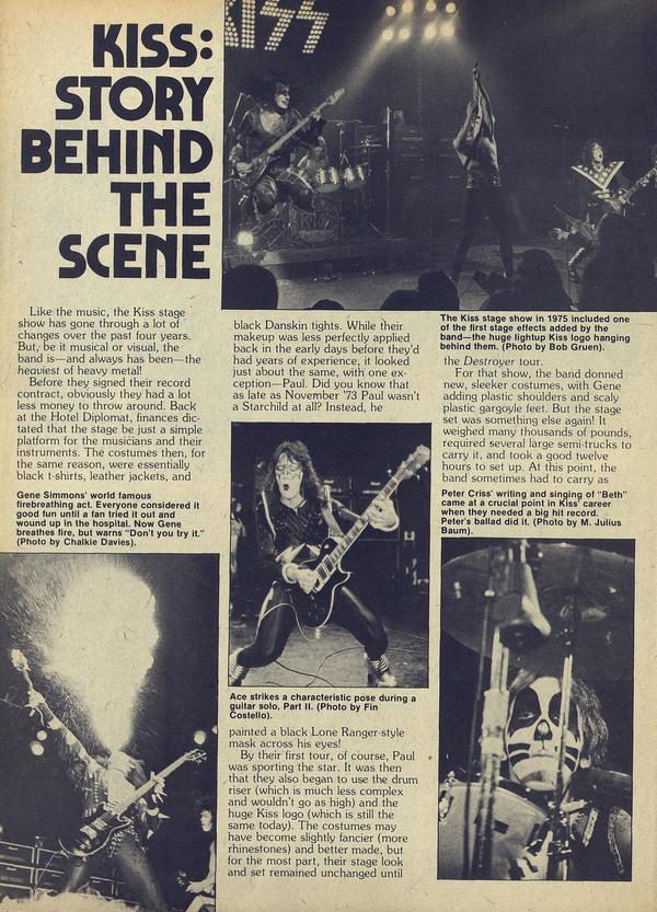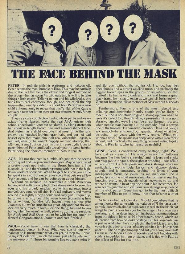 As master rock & roll illusionists, Kiss have made it a cardinal rule that they will never be photographed in public without their make-up. Once or twice this rule has been broken, but as far as we know only one Scandanavian magazine has ever printed such pictures—and at that it was only Gene in a long overcoat, collar turned up, a fuzzy image walking through the cold winter outside his hotel.