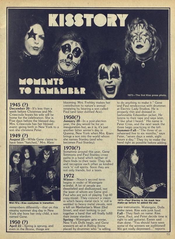 PAUL used to chop liver in a delicatessen during the summer. ACE married his girlfriend Jeanette in early ’77. GENE taught school at P.S. 75 in Manhattan for six months. PETER learned to play drums on a vintage 1920 Gene Krupa-style drumkit.