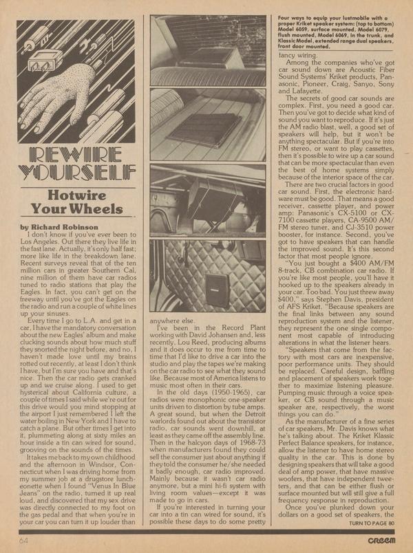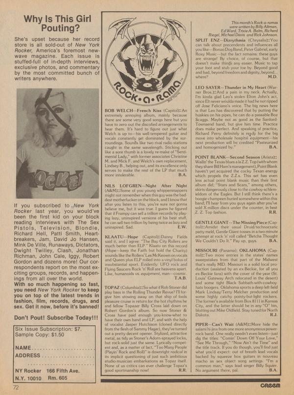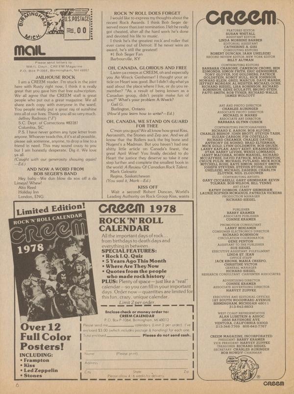 Please send letters to: MAIL Dept., CREEM Magazine P.O. Box P-1064, Birmingham, Ml 4801? JAILHOUSE ROCK I am a CREEM reader. I’m stuck in the joint here with Rusty right now, I think it is really great that you gave him that free subscription.