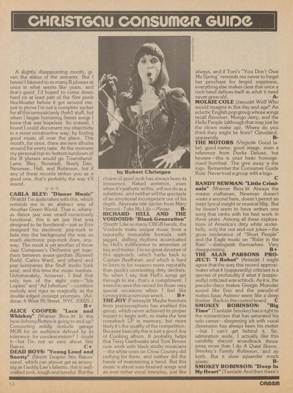 A slightly disappointing month, given the status of the entrants. But I haven’t listened to so many B plusses at once in what seems like years, and that’s good. I’d hoped to come down hard on at least part of the Sire punk blockbuster before it got around me, just to prove I’m not a complete sucker for all this unmusicianly (hah!) stuff, but when I began humming Saints songs I knew that was hopeless.